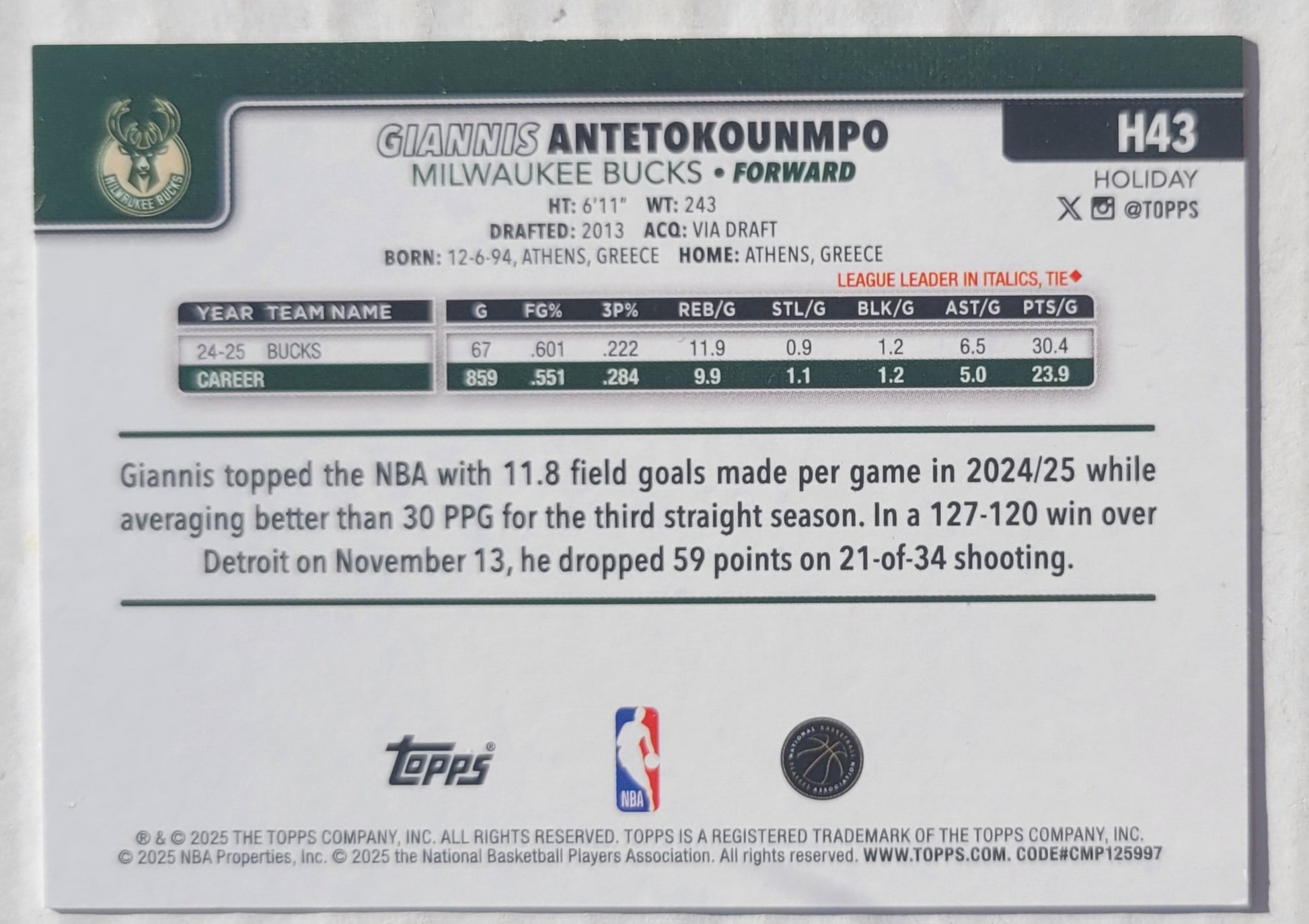 Giannis Antetokounmpo - 2025-26 Topps Holiday Plaid #H43