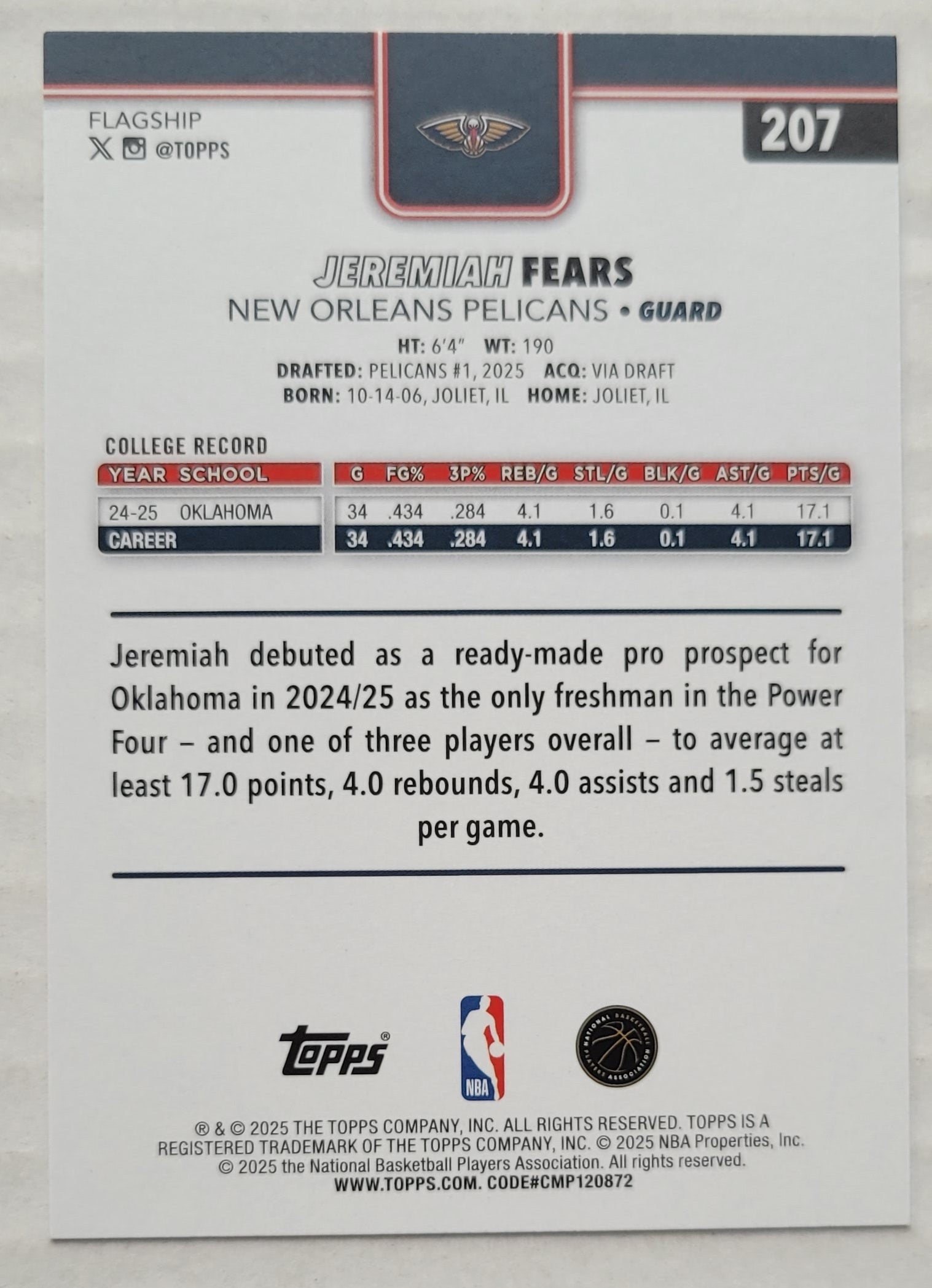 Jeremiah Fears - 2025-26 Topps #207 RC